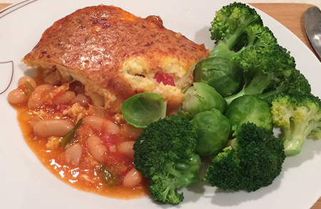 Place ratatouille, beans, onion and sweet chilli sauce in a small, deep, oblong baking dish which has been sprayed with non-stick cooking spray. Beat eggs and cottage cheese together and spread on top. Scatter grated cheese over and bake at 180 degrees for about 50 minutes, or until the cottage cheese and egg mixture has set and the top is lightly browned.